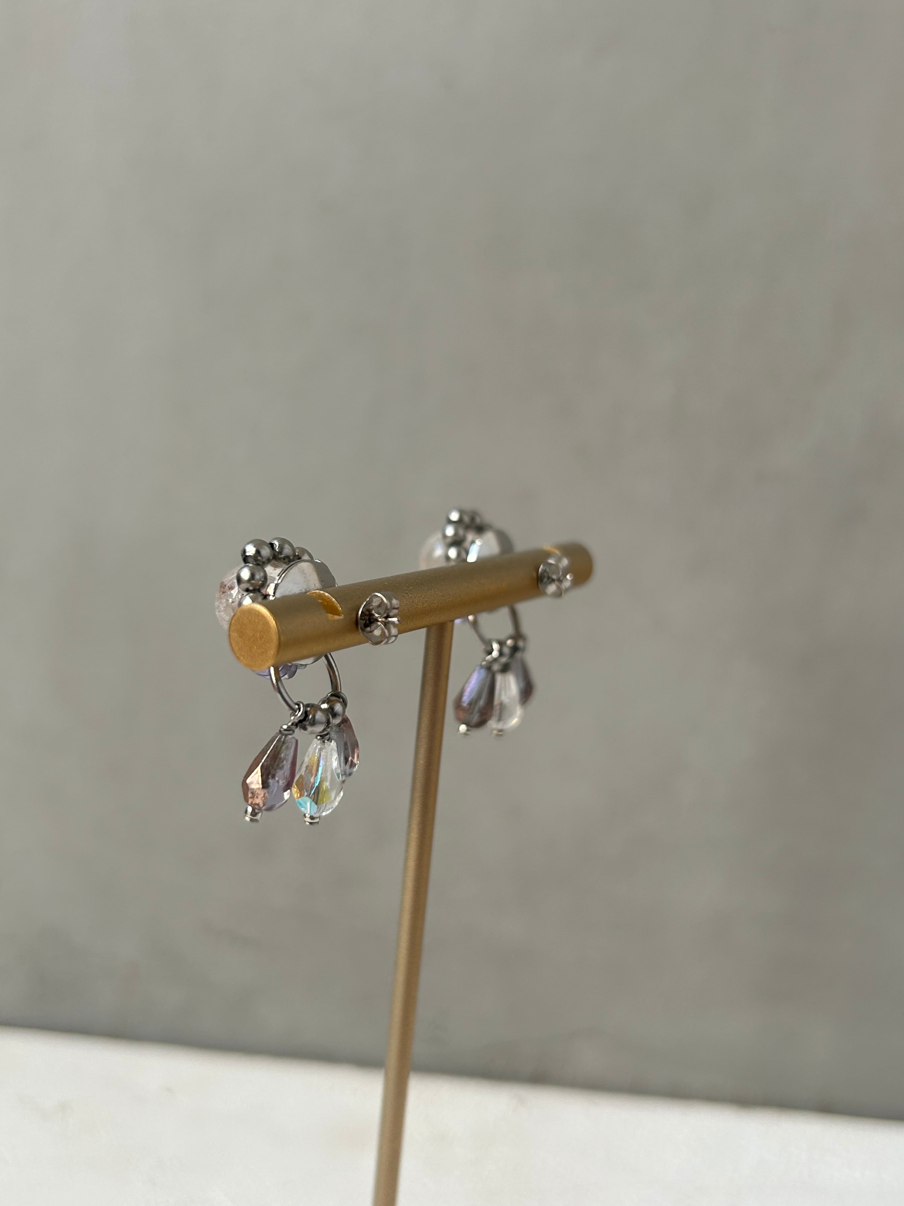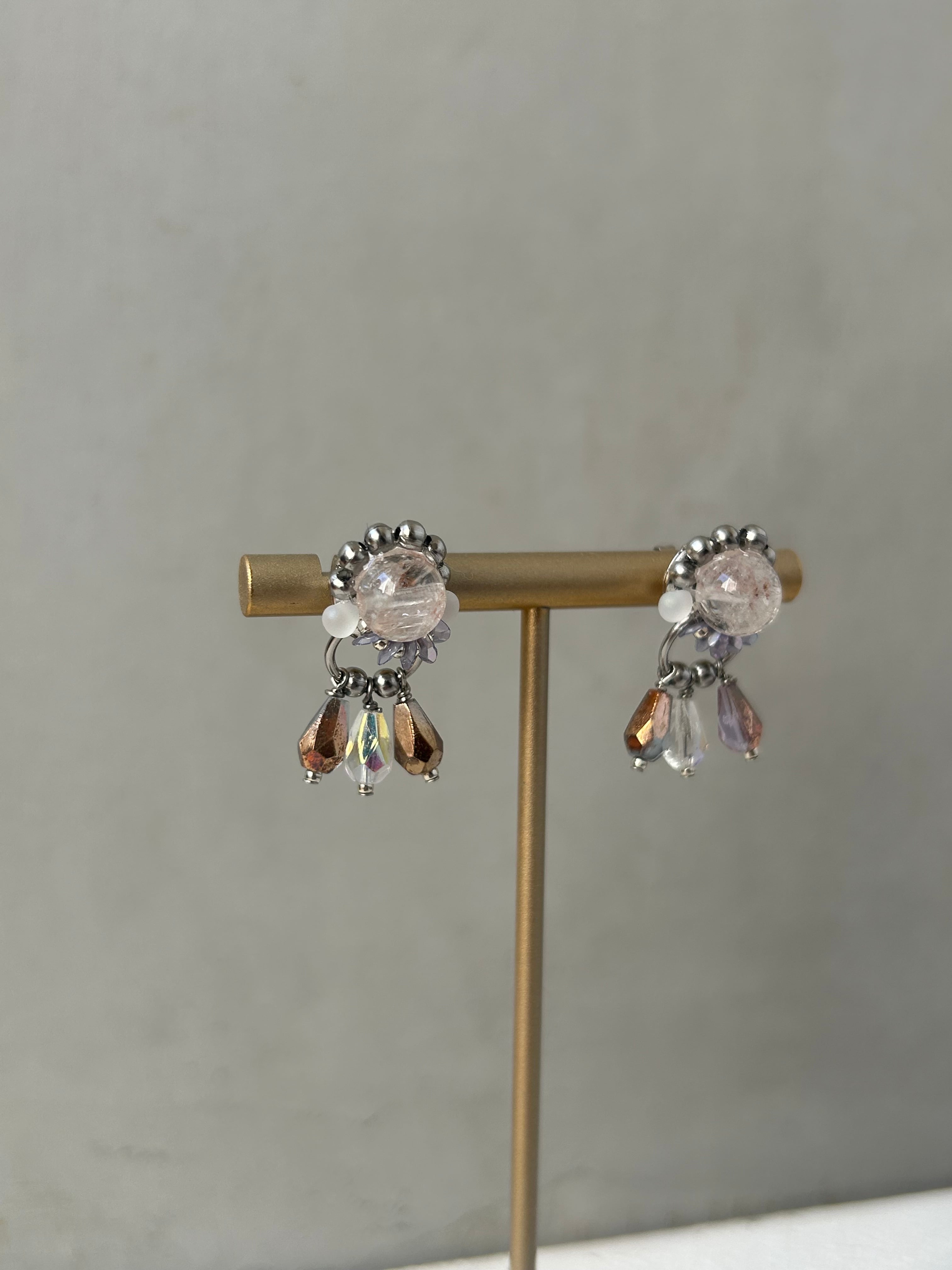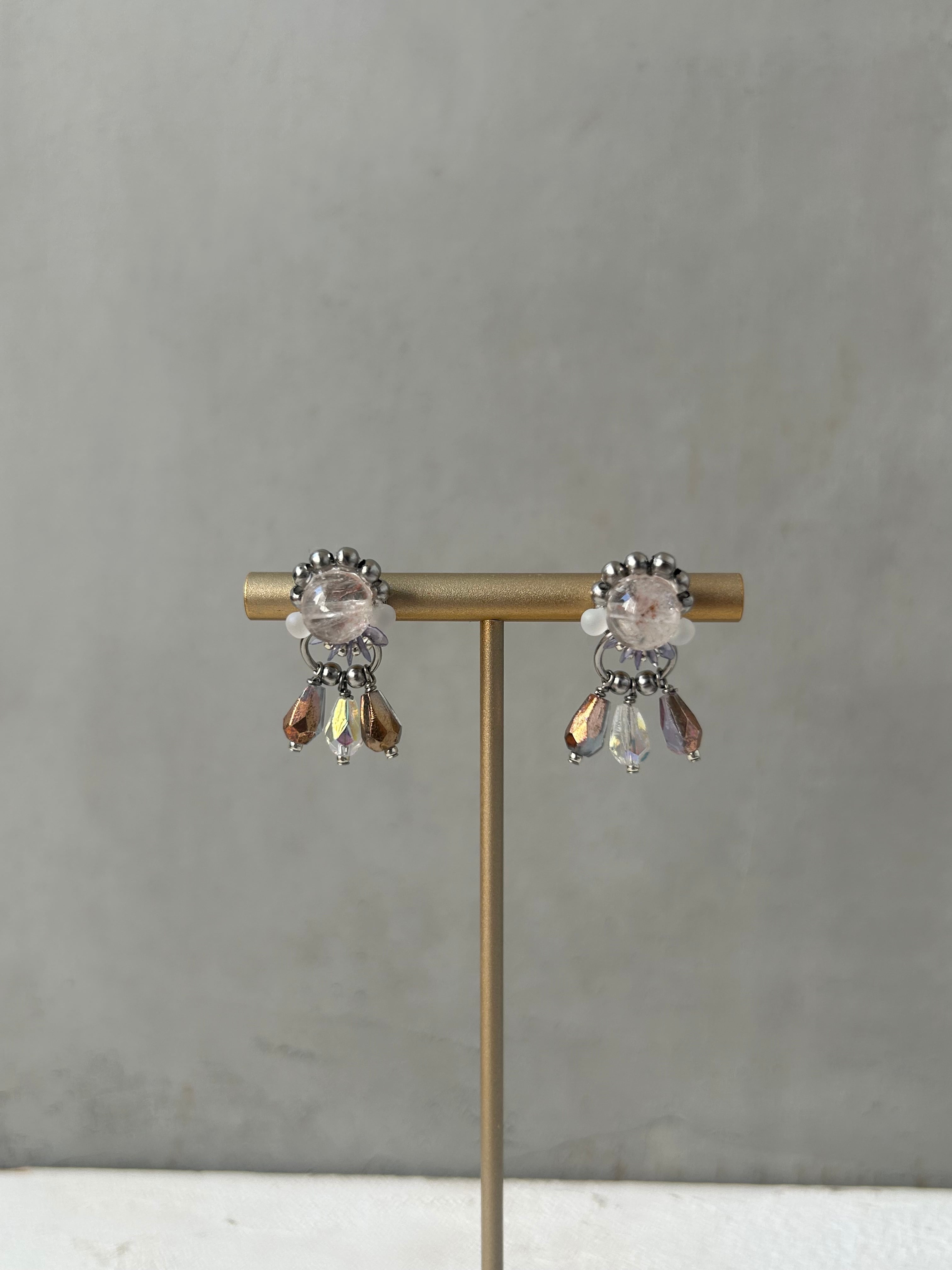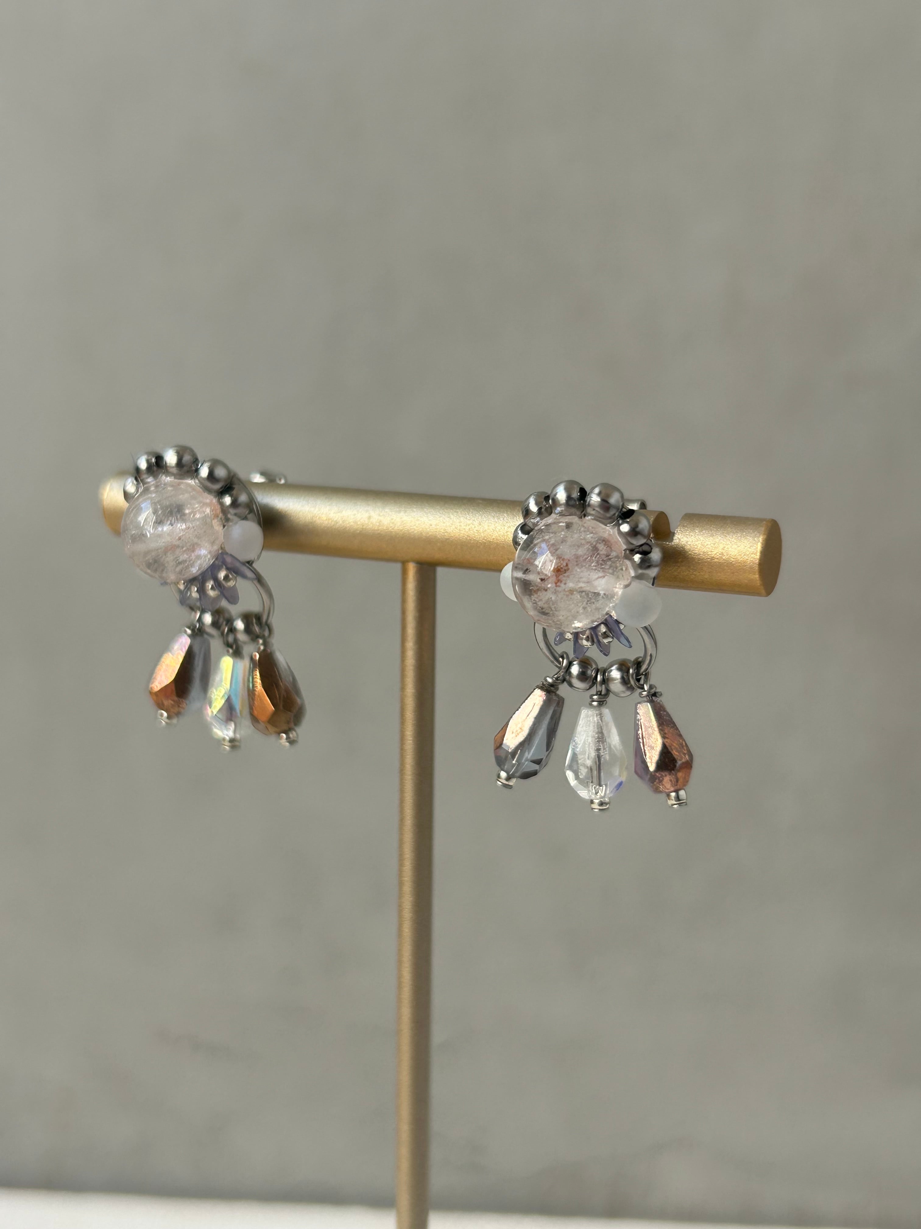 ヒマラヤ水晶を使用したピアス・イヤリングは、可愛らしさとかっこよさを組み合わせて存在感のあるデザインに仕上げています。マニカラン産特有の、ほんのりピンクがかった透明感が魅力です。