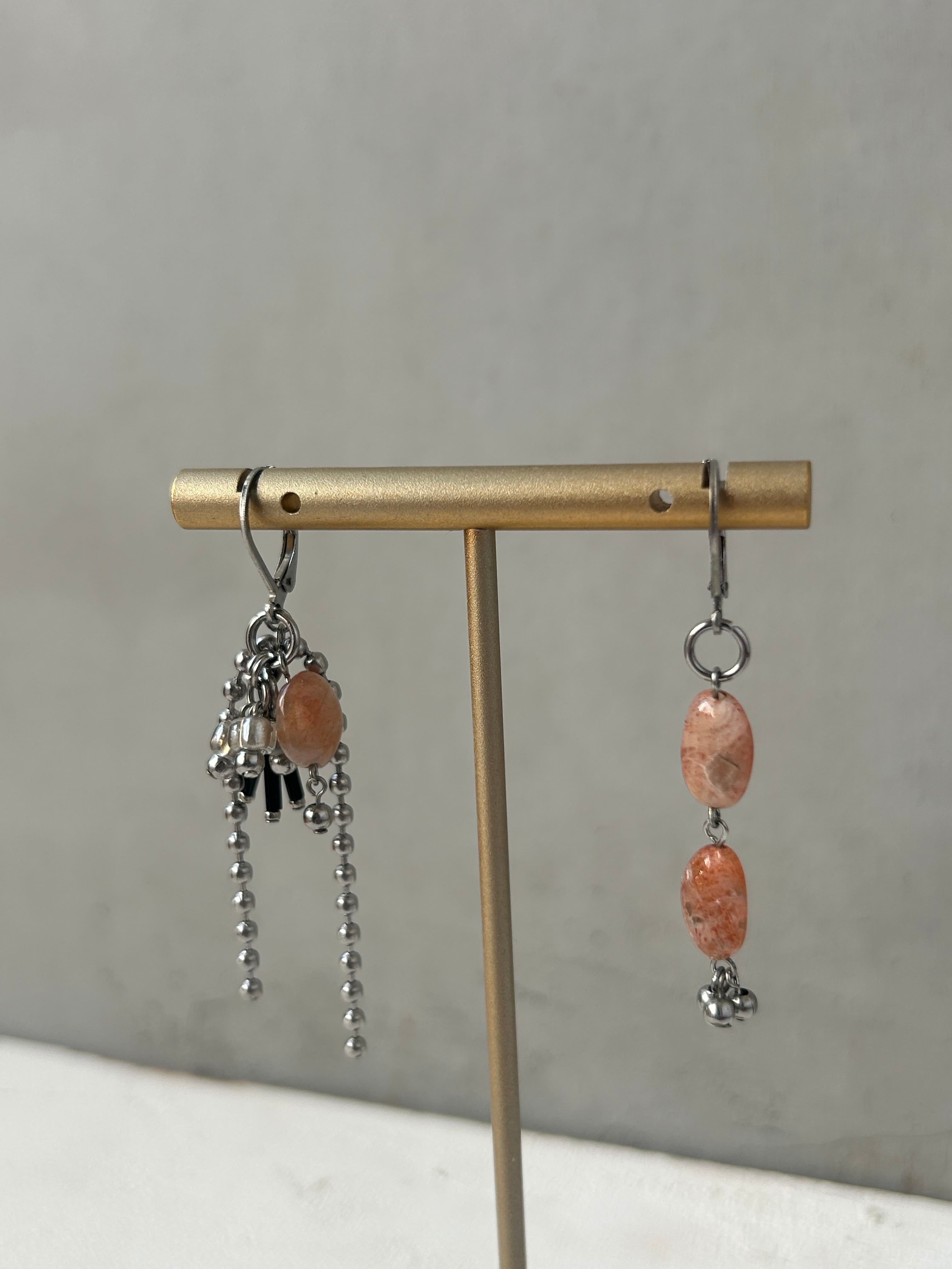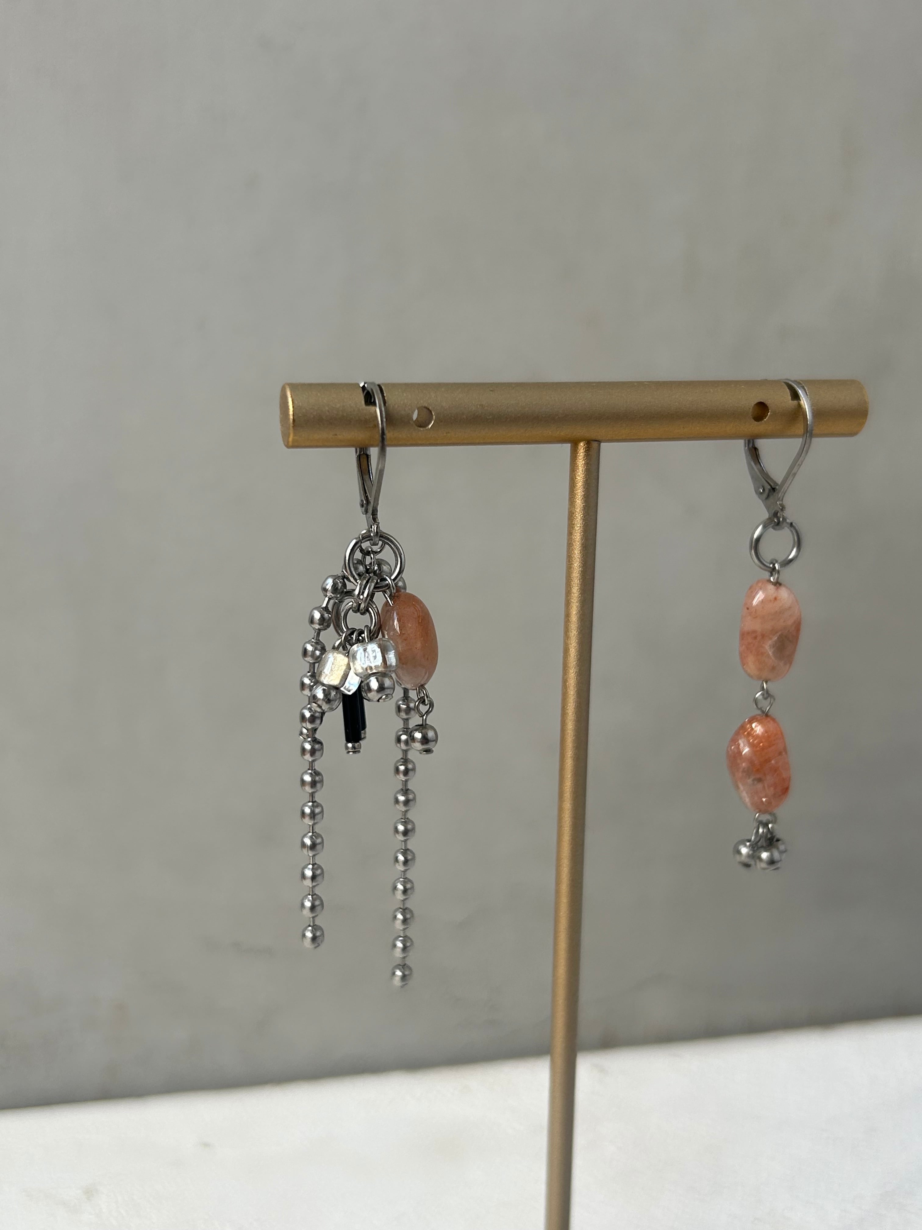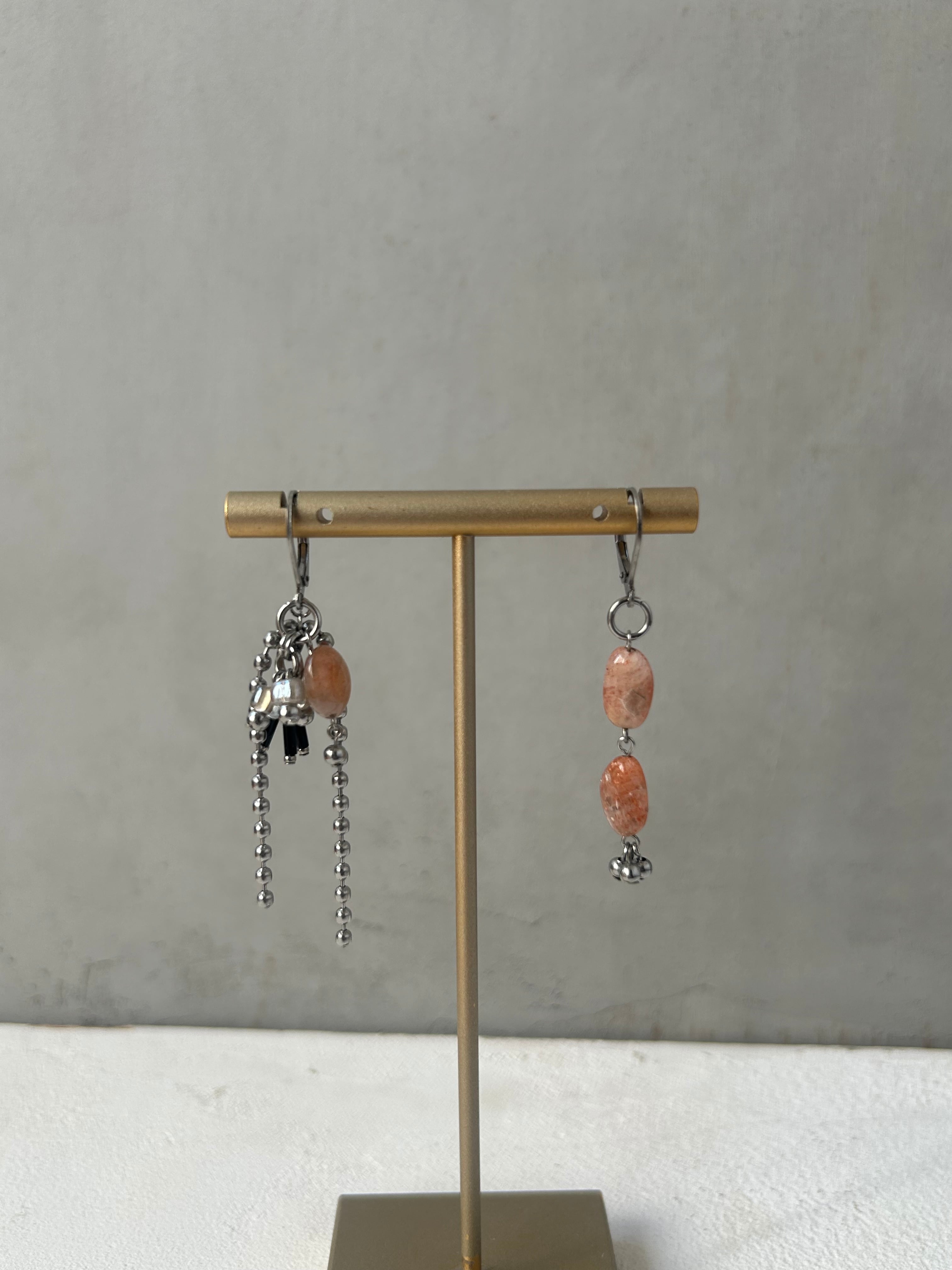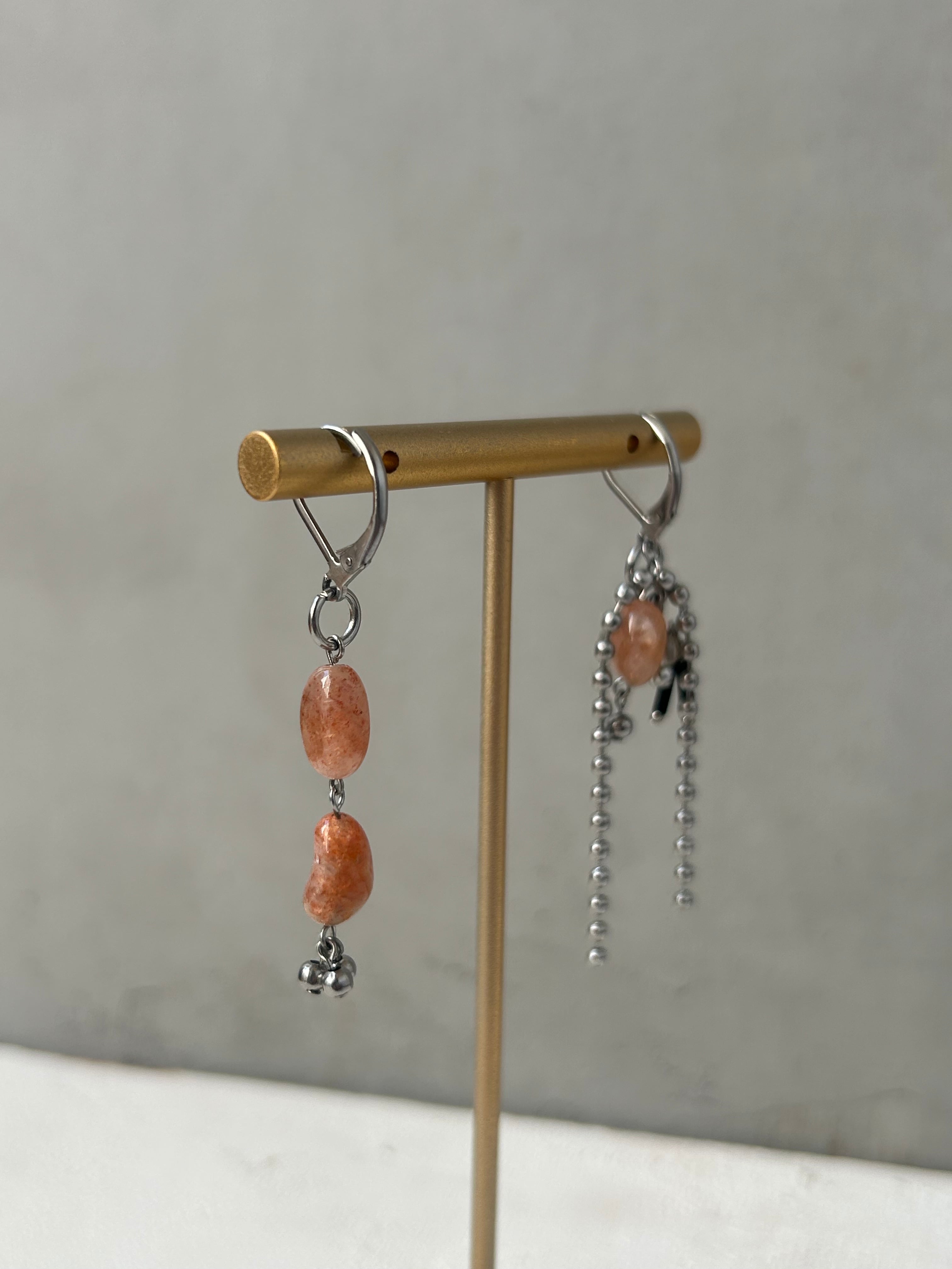 サンストーンと、揺れるチェーンのデザインが特徴でアシンメトリーなデザインに仕上げています。甘くなりすぎないデザインなので普段のコーデにプラスするだけでほどよいアクセントになります。