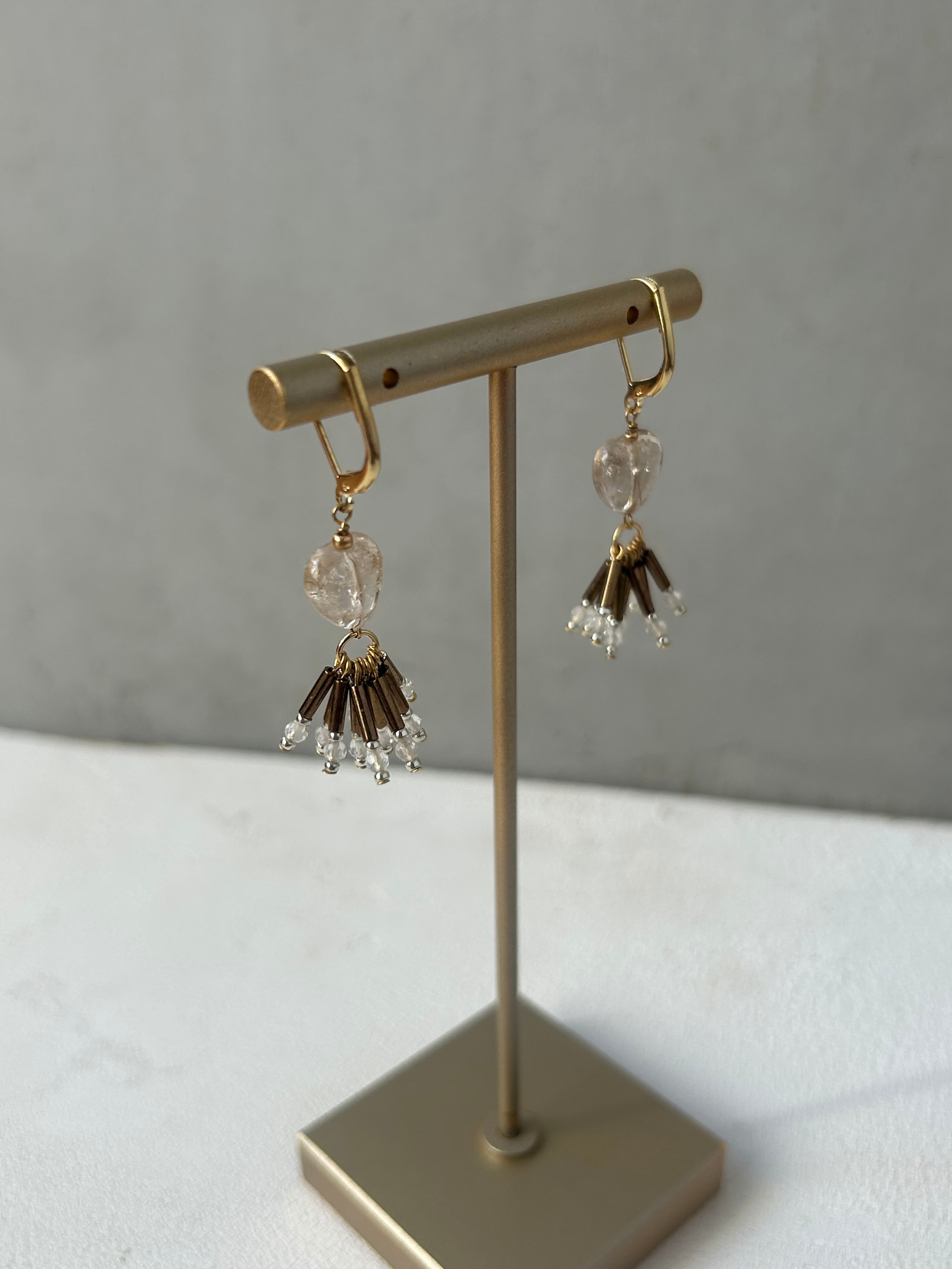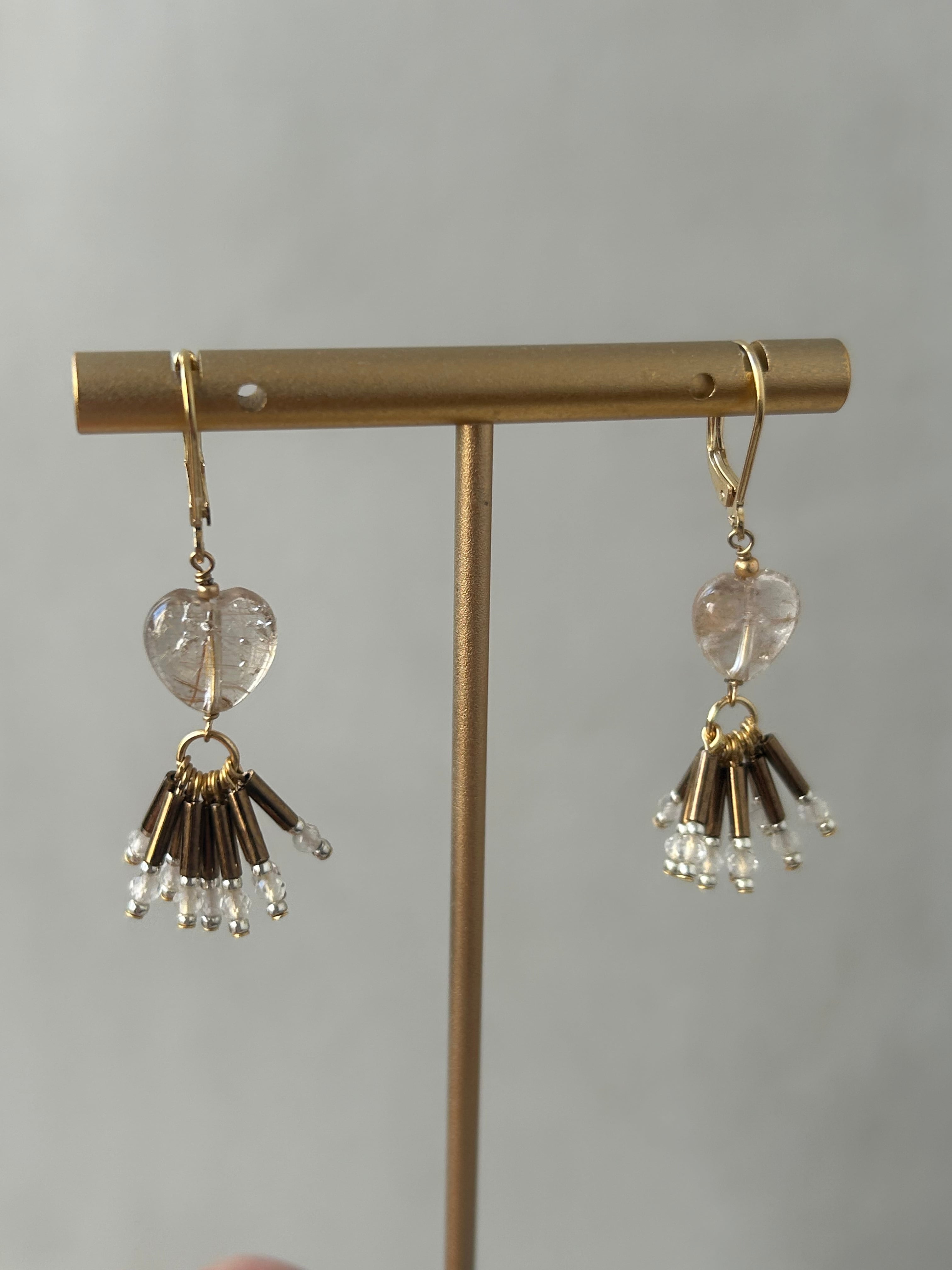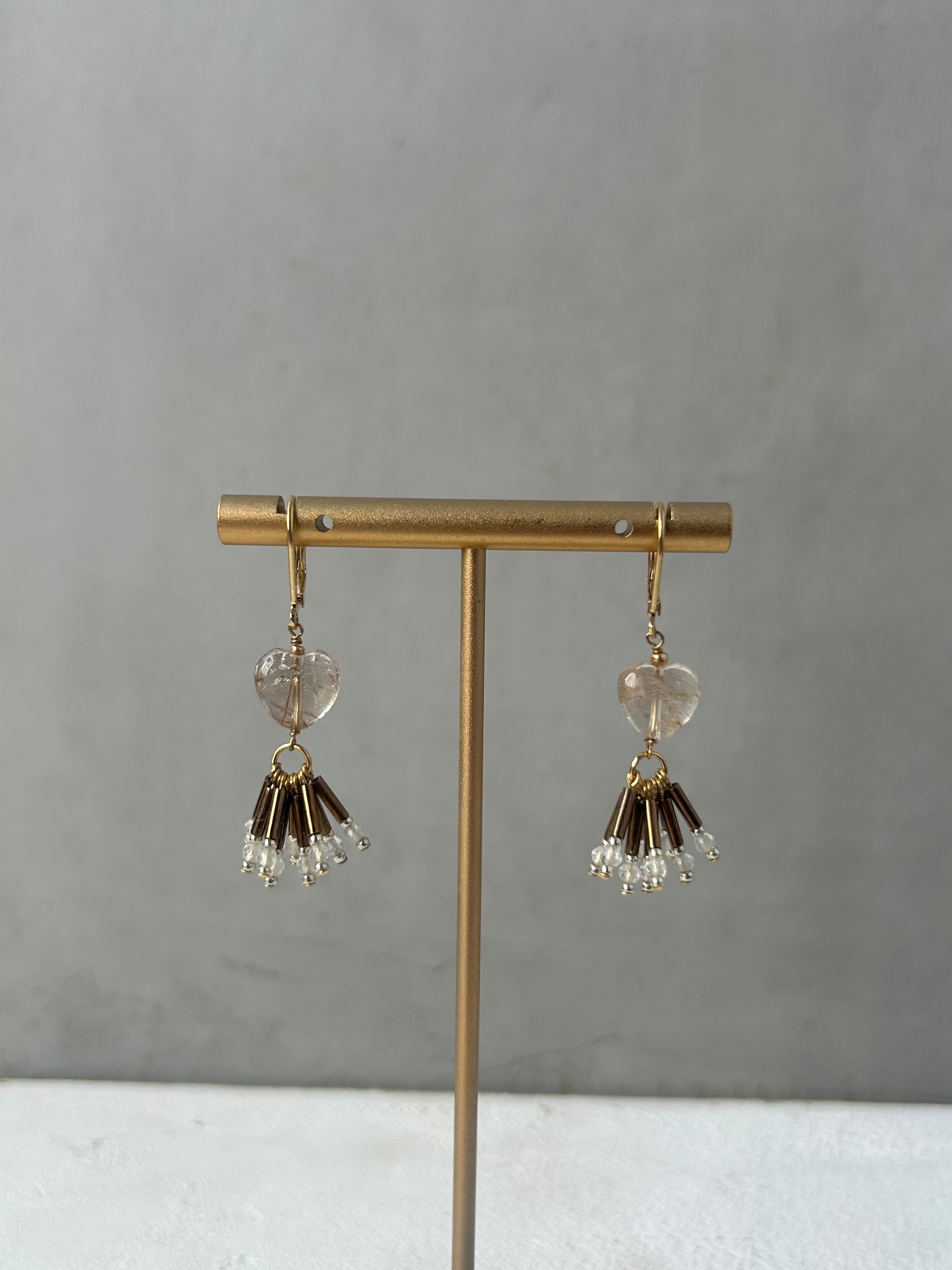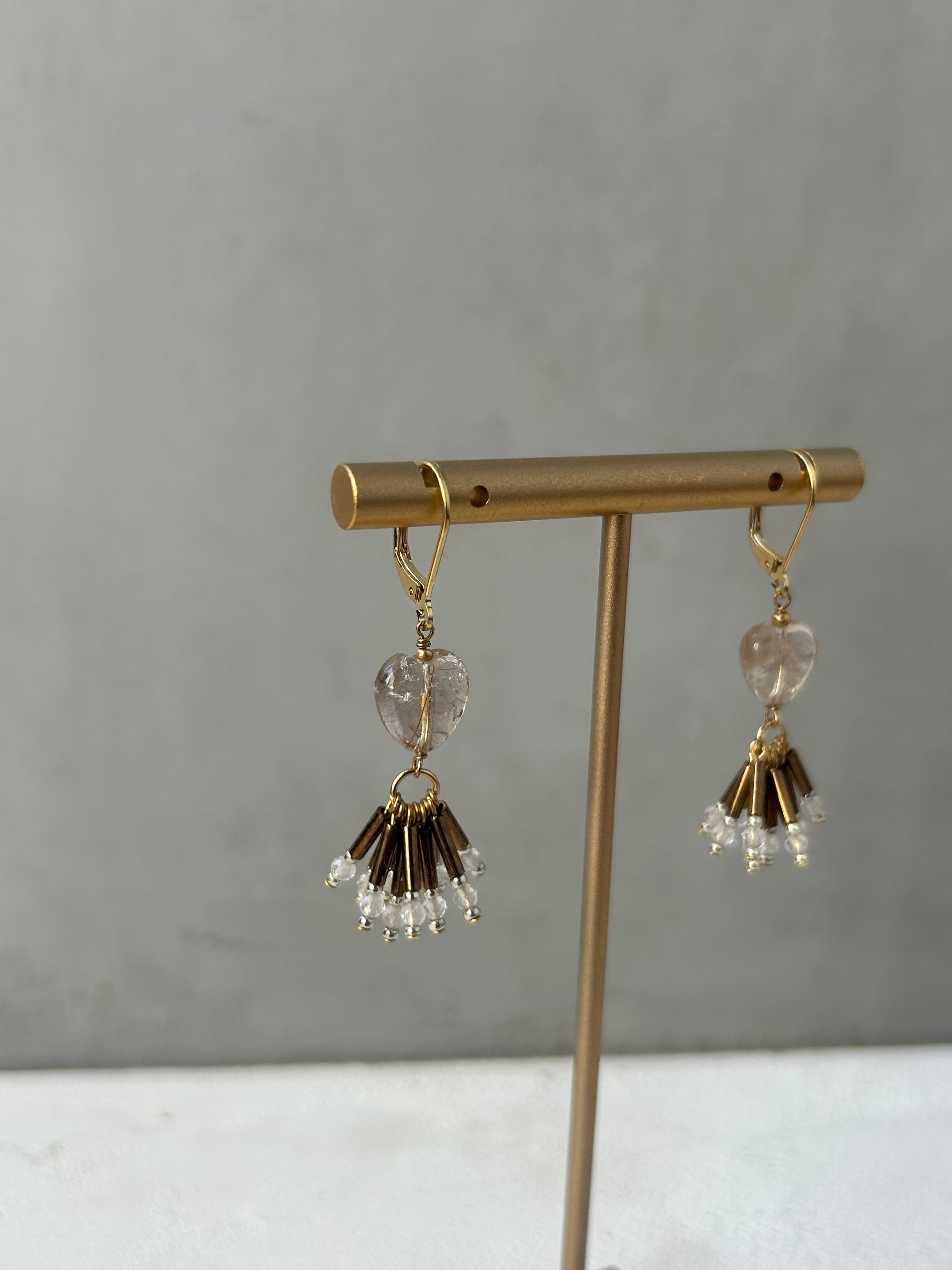針水晶を使用したピアス/イヤリングです。ハートの形が特徴的で、優しさと可愛らしさを演出します。揺れる部分には竹ビーズと水晶を使用しています。日常のコーディネートに自然に溶け込み、さりげないおしゃれを楽しめるアイテムです。