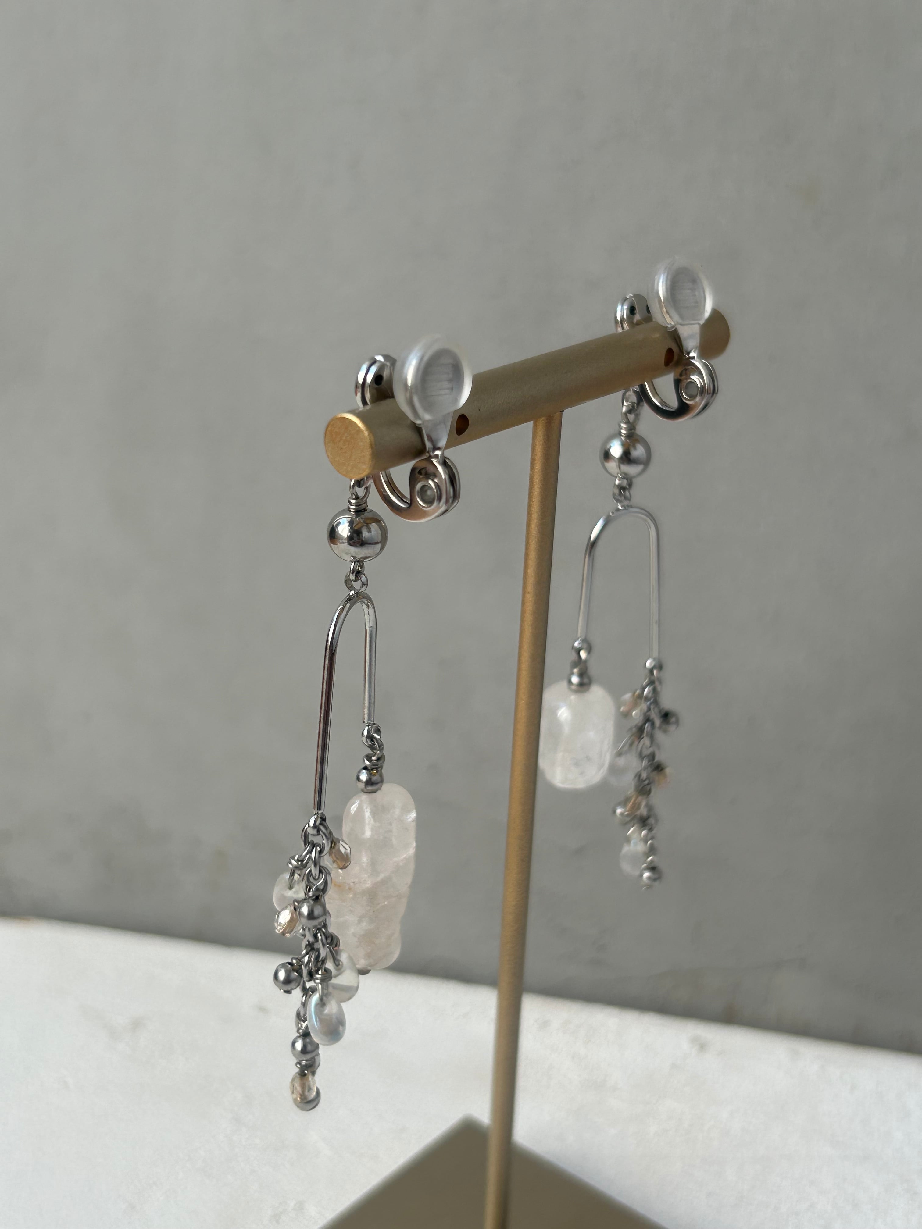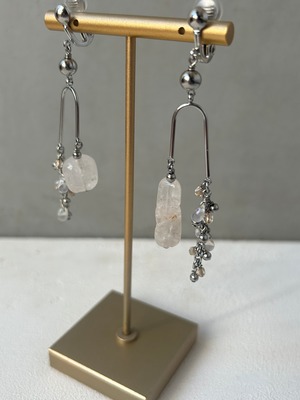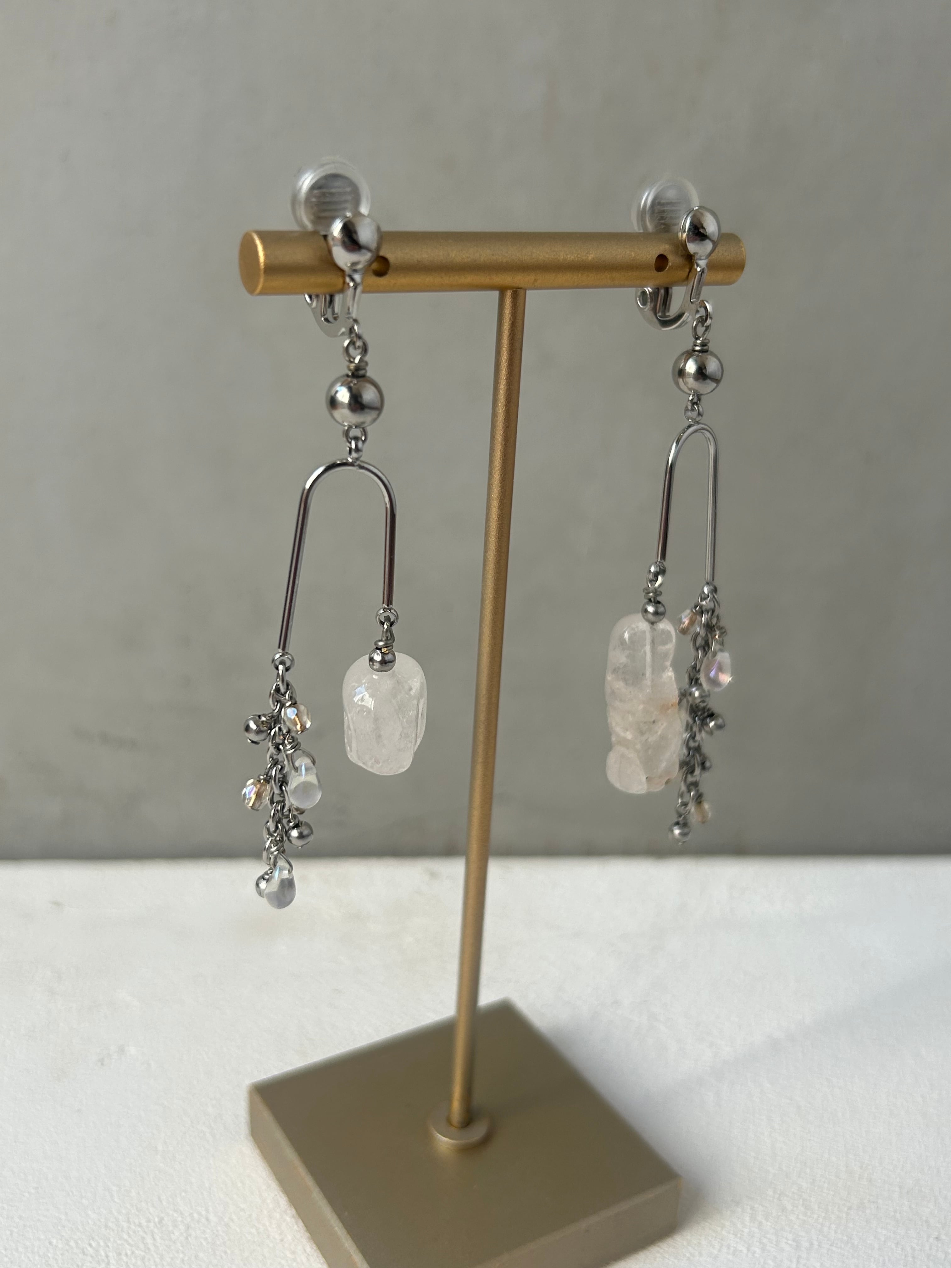 ほんのりピンク色のアイスクリスタルクォーツを使ったロングサイズのイヤリングです。揺れるたびに美しい輝きを放ち、日常のコーディネートに華やかさをプラスします。